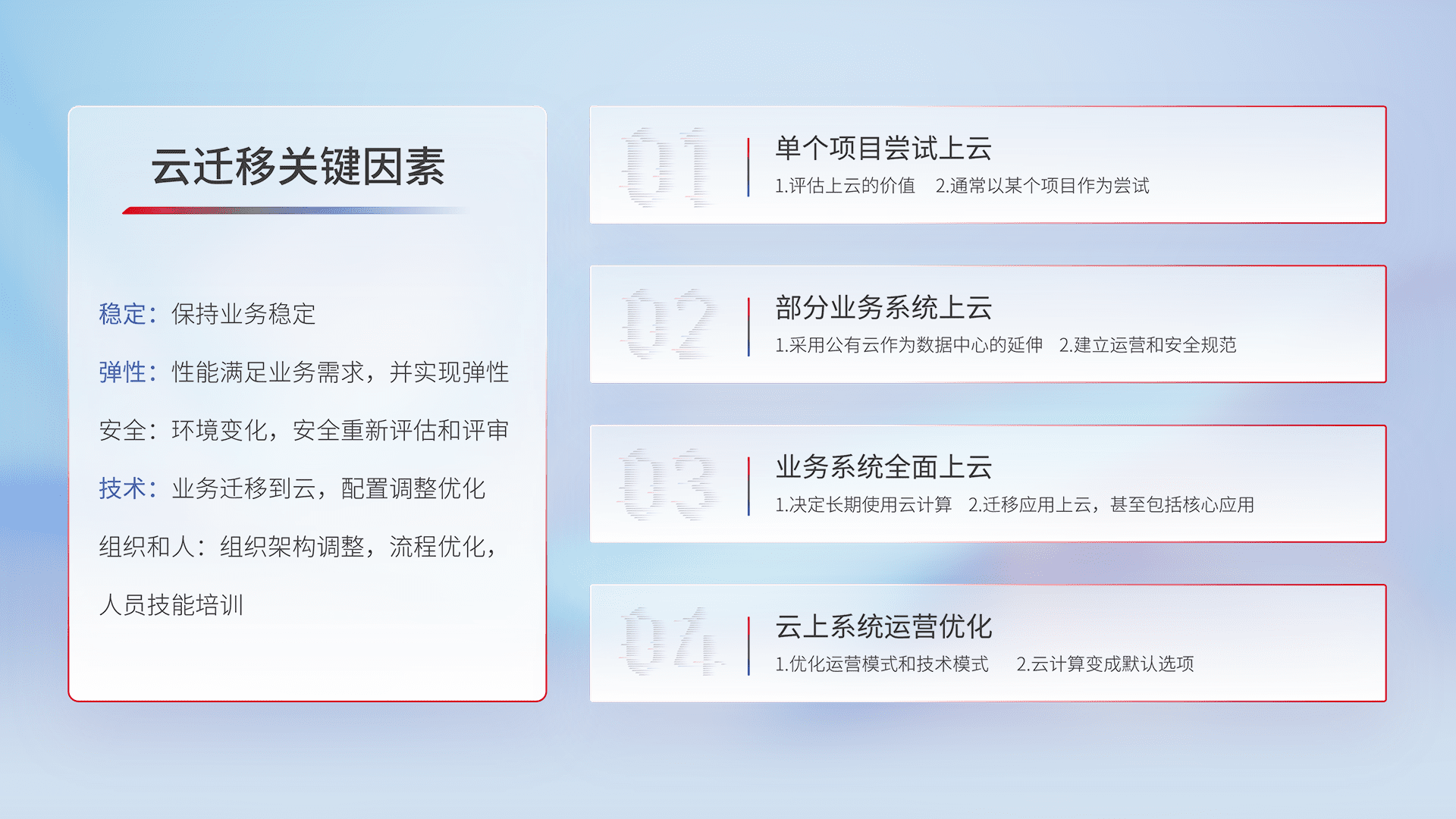 结合实际业务,,,,从规划设计、、、、云平台选型、、、、云原生改造、、、数据迁移、、、集成交付,,,,迁移全过程为客户识别最佳上云路径,,做好风险识别管理,,,设计网络架构、、身份权限、、、安全审计合规、、操作审计、、、日志审计、、、、监控告警策略、、、多站点容灾设计等,,,,对云上基础设施进行整体规划,,,,提升IT治理水平,,,,以满足弹性、、高可用、、、高性能的需求。。。。