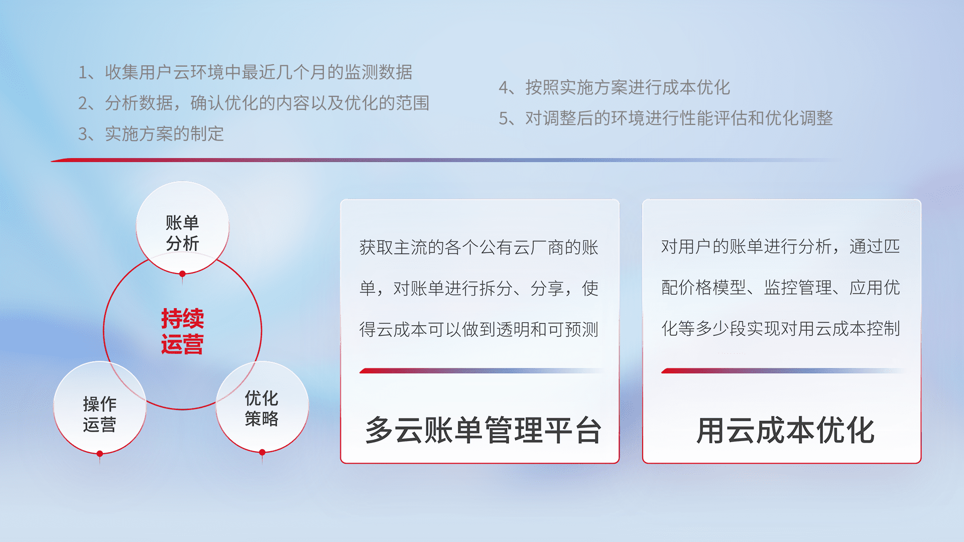 通过多云纳管,,,以统一的资源数据模型把客户的云资源进行抽象和封装,,,进而实现对多云资源的统一操作,,,,保障云资源管理的可靠性、、、稳定性与可用性。。。。量身定制化运维内容,,,配置、、、、开发运维、、补丁管理、、、备份、、、监控、、认证和访问管理、、、、审计和日常巡检等,,,保障在用云过程中的可靠度,,稳定度以及高可用率。。